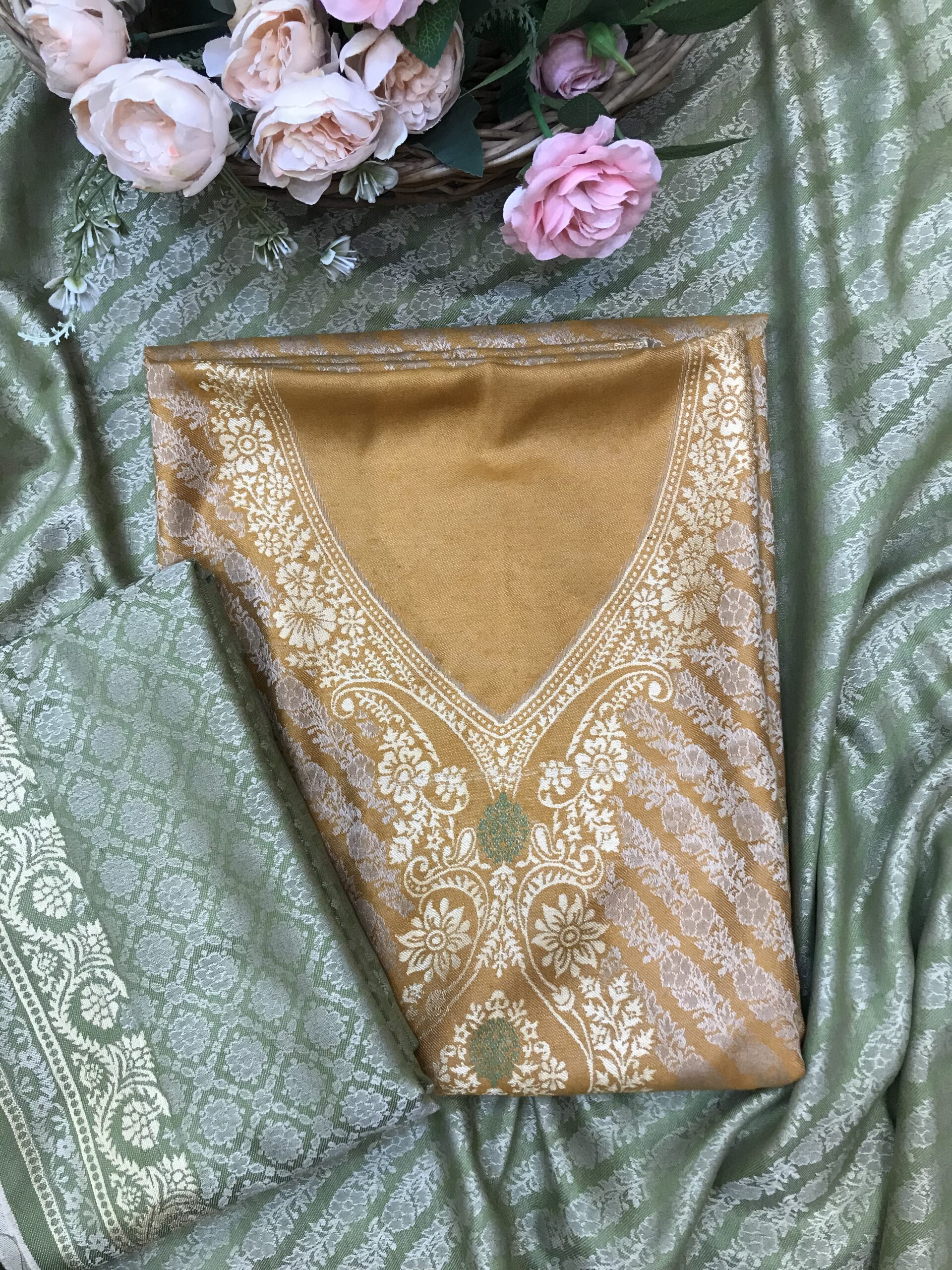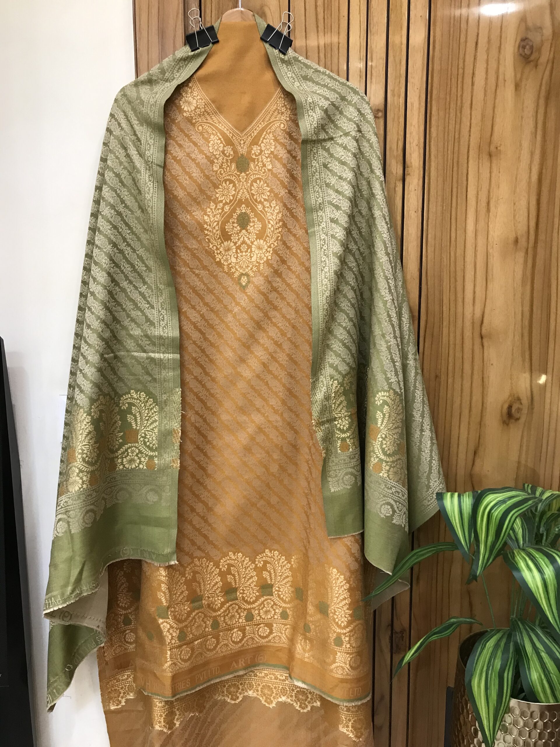 Be the first to review “Mustard Color Woolen Kashmiri Kani Work Unstitched Suit Fabric With Stole”