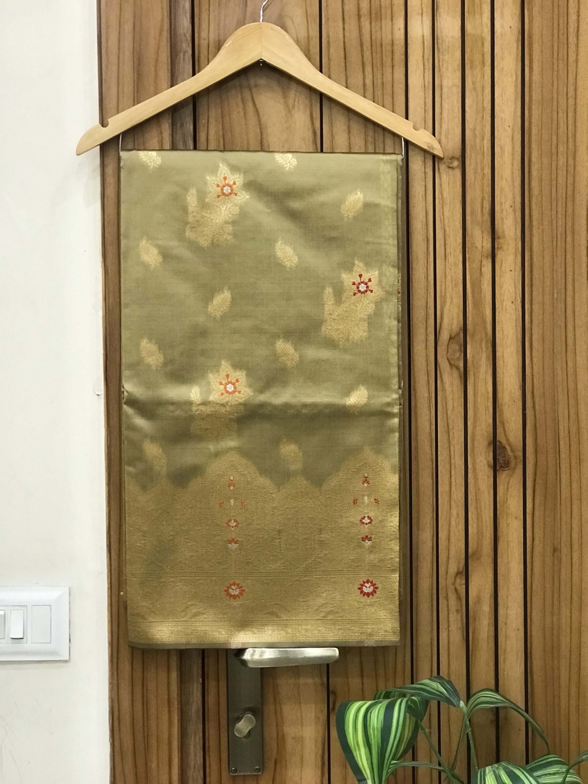 Olive Gold Soft Banarasi Silk Saree with Meenakari work and golden zari booti
