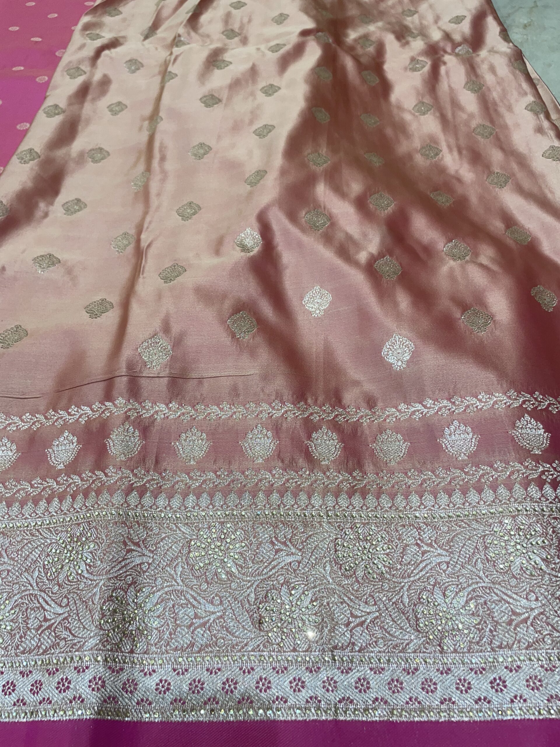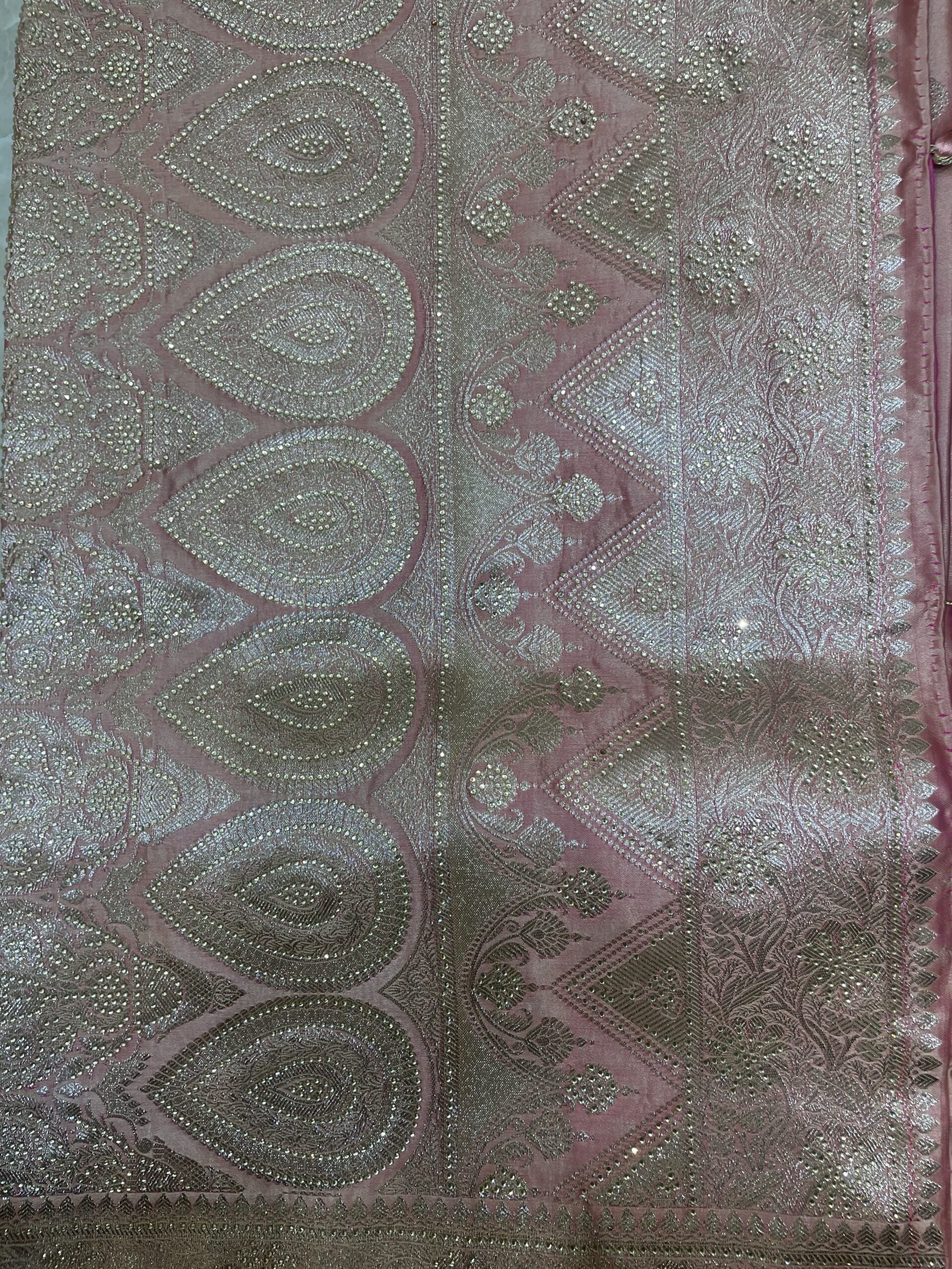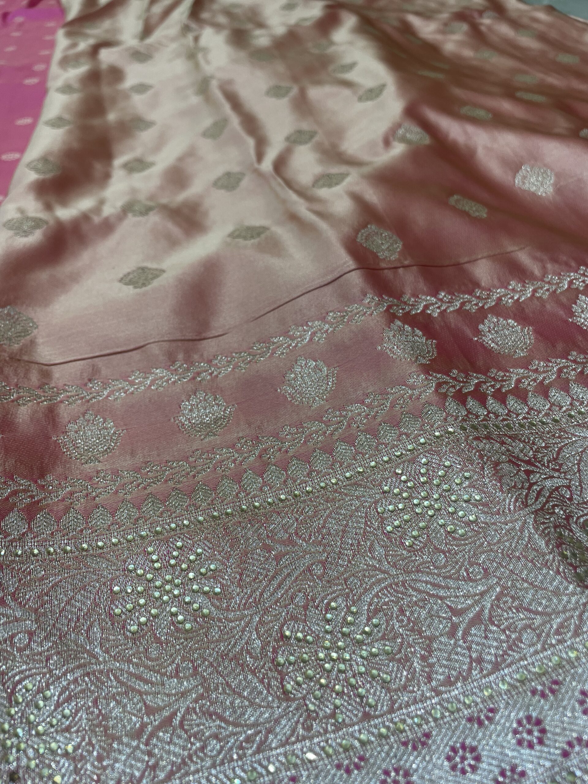 Pastel Pink Satin Silk Banarasi Saree with Swarovski and Golden Zari Booti Work