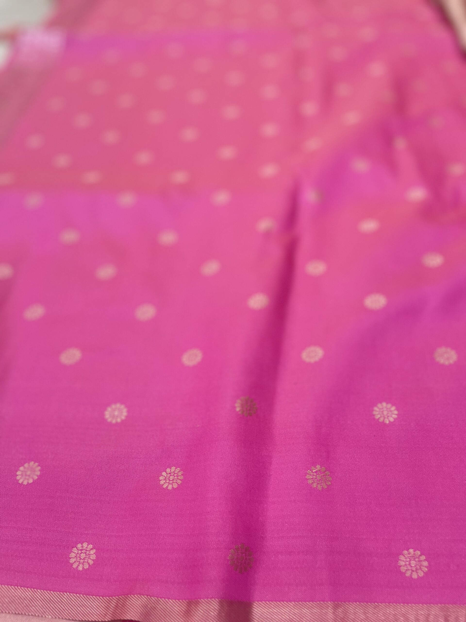 & Free ShippingExperience the luxurious feel of our Banarasi Satin Silk Golden Zari Woven Saree. Made from high-quality Banarasi Satin Silk, this saree features intricate gold zari weaves booti all over the body. The rich zari woven pallu adds a touch of elegance, making it perfect for any occasion. Paired with a contrast hot pink colour zari blouse for a complete look.