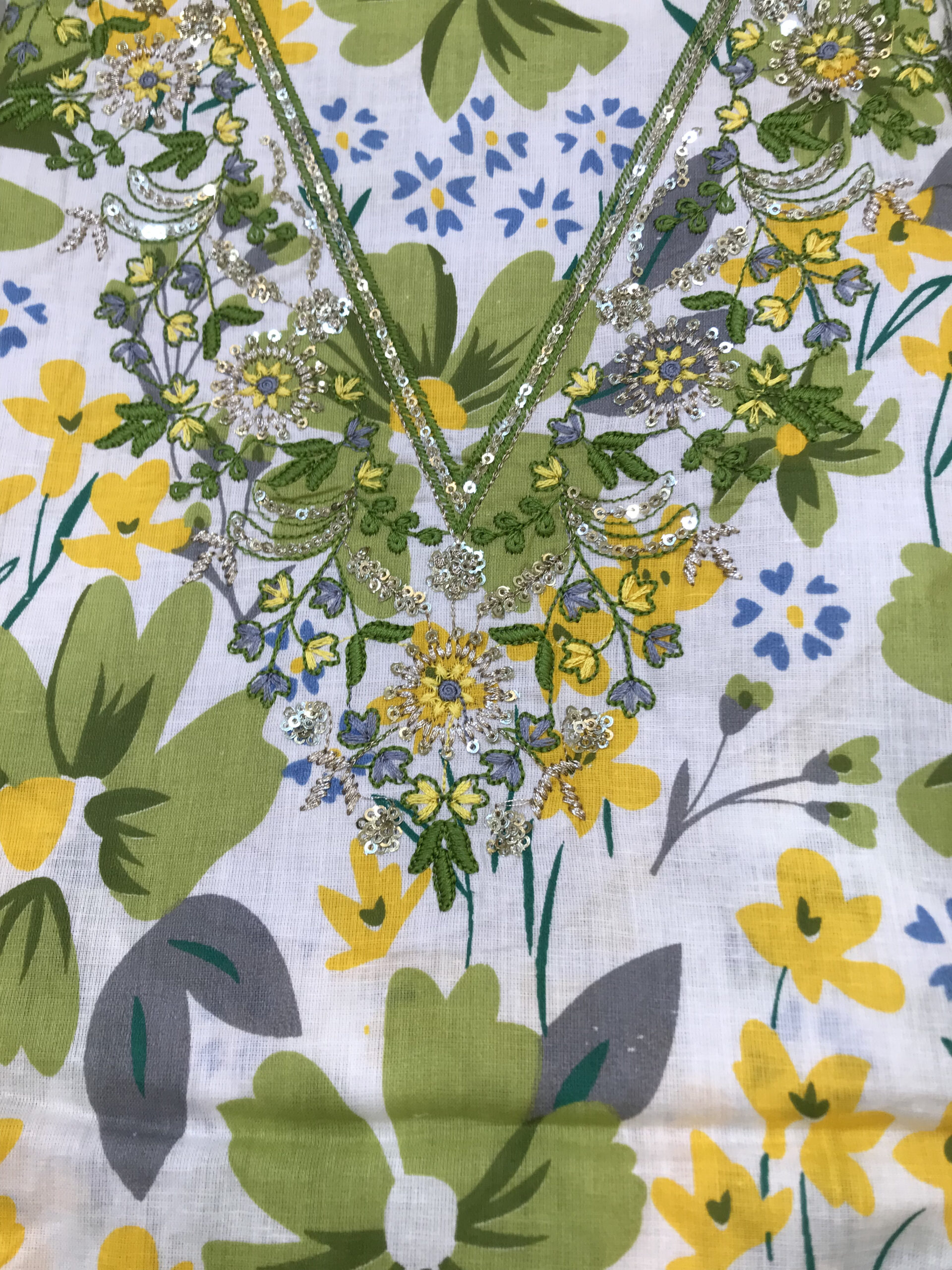Craft: Traditional handblock-inspired print with detailed neckline embellishment