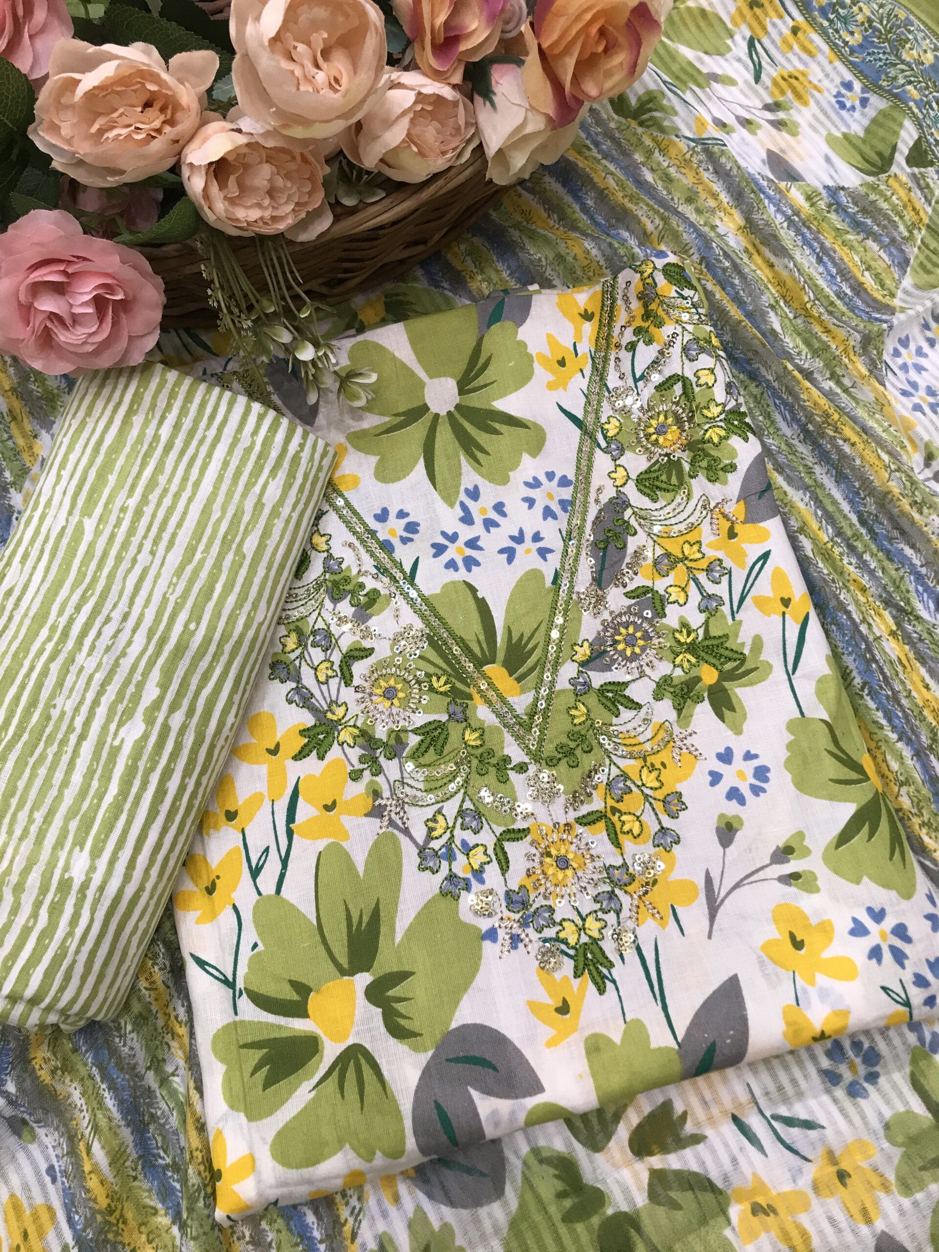 & Free ShippingBright as morning sunshine and rooted in tradition, this green cotton suit set is a graceful blend of comfort and craft. Designed for effortless elegance, the set features a beautifully printed kurta adorned with delicate motifs, paired with a soft, breathable bottom and a statement dupatta enriched with intricate traditional patterns.
