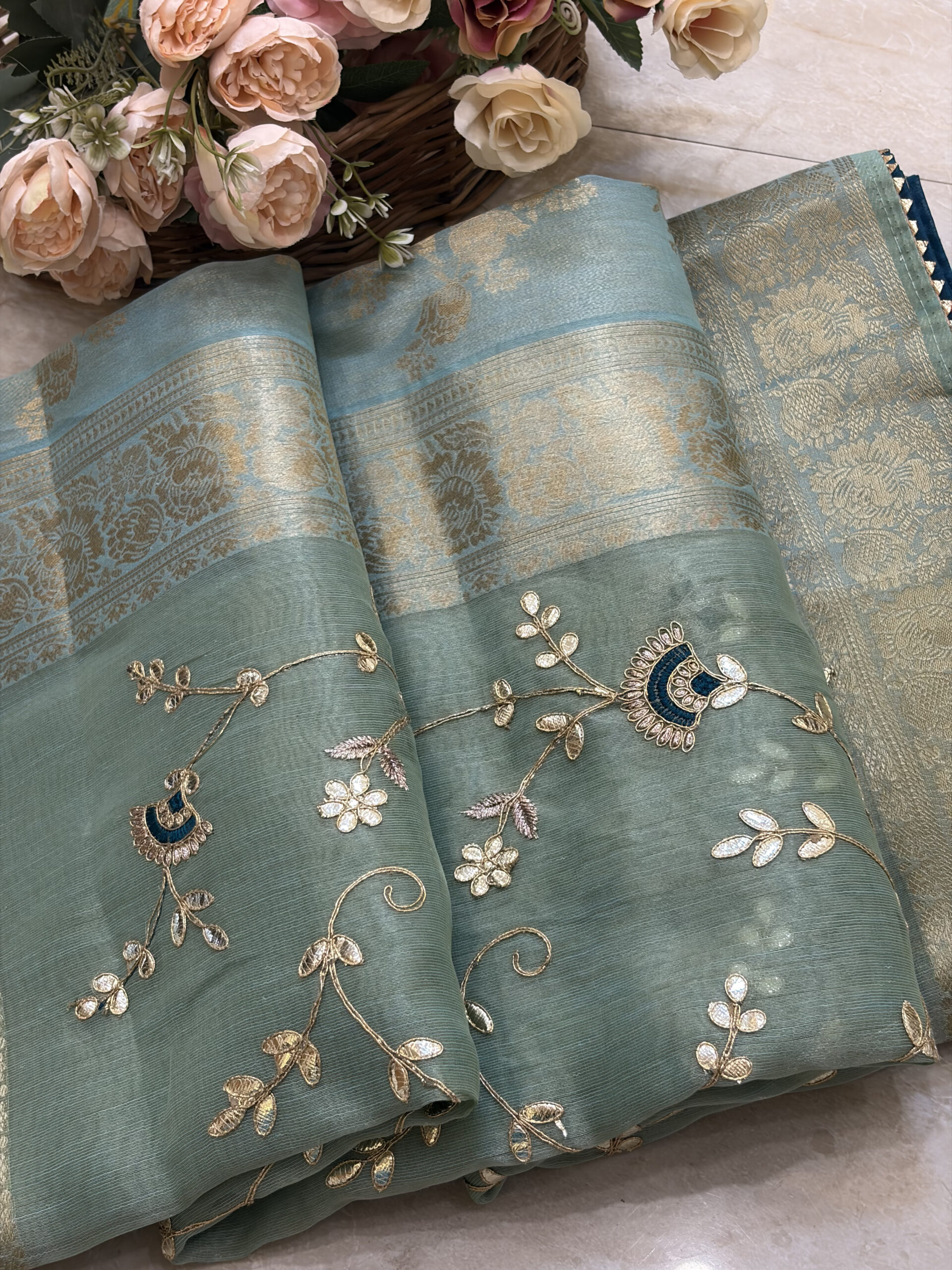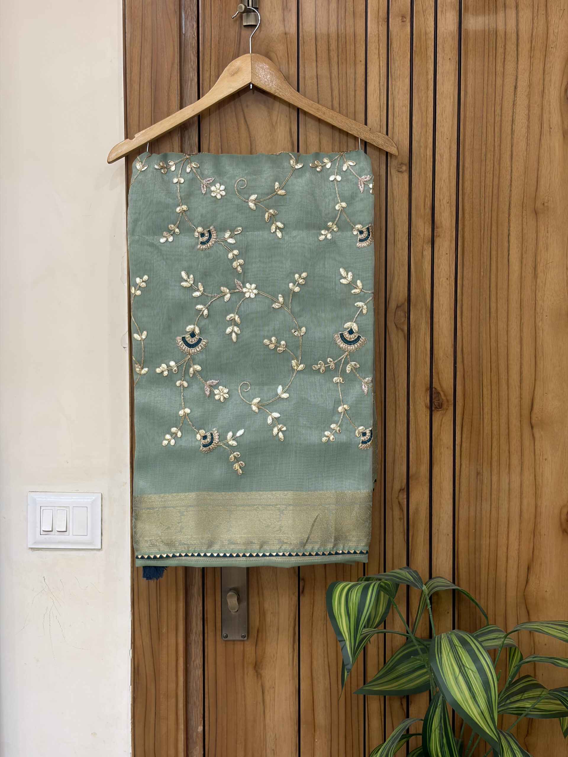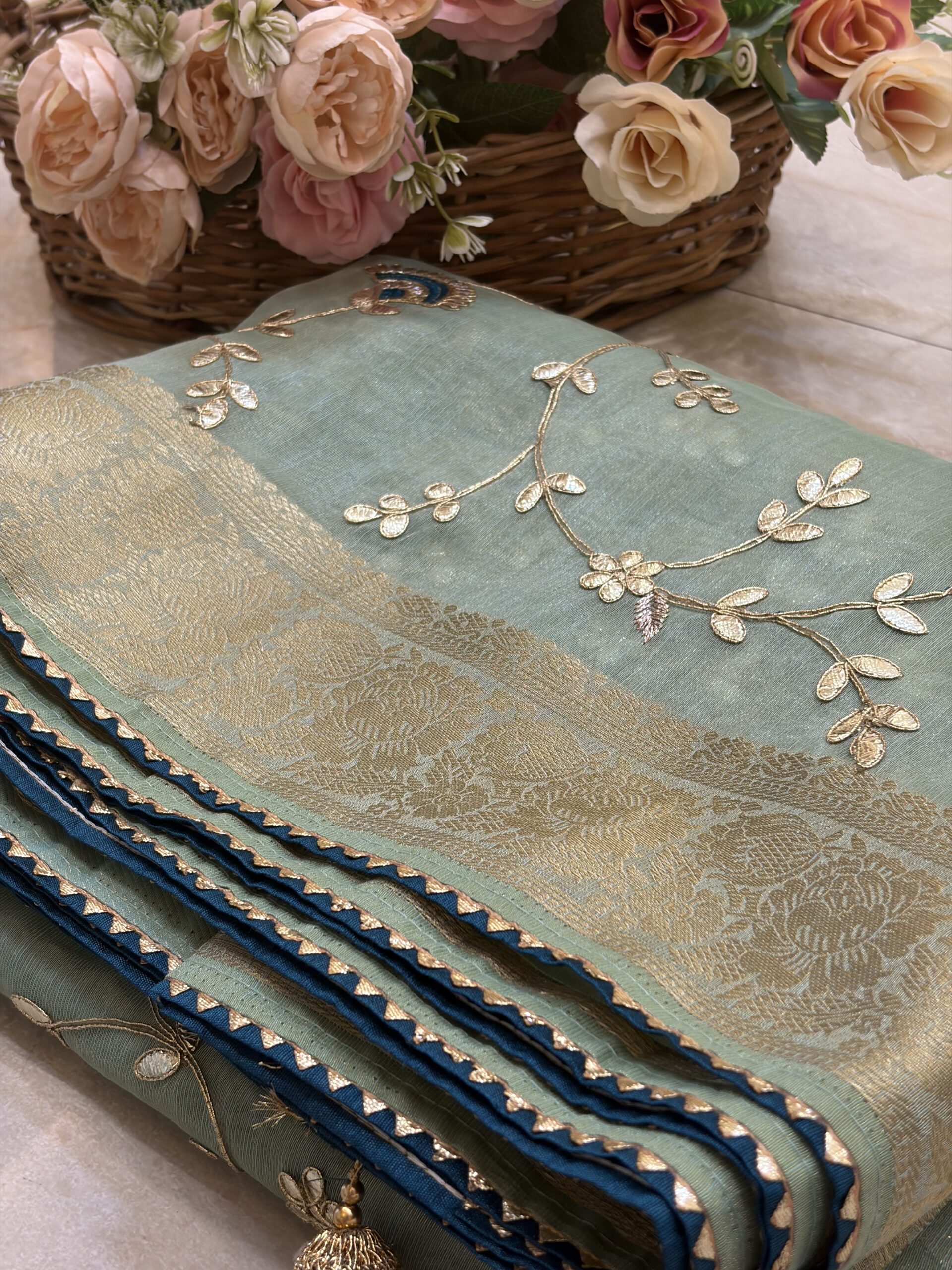 Premium Pastel Sea Green Organza Saree with Gota Patti Jaal Work