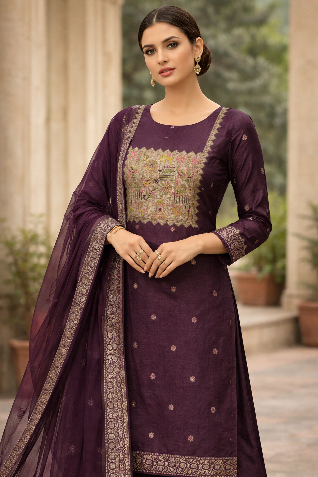 premium wine colour chanderi silk suit with resham embroideryPremium Wine Colour Chanderi Silk Suit with Resham Embroidery