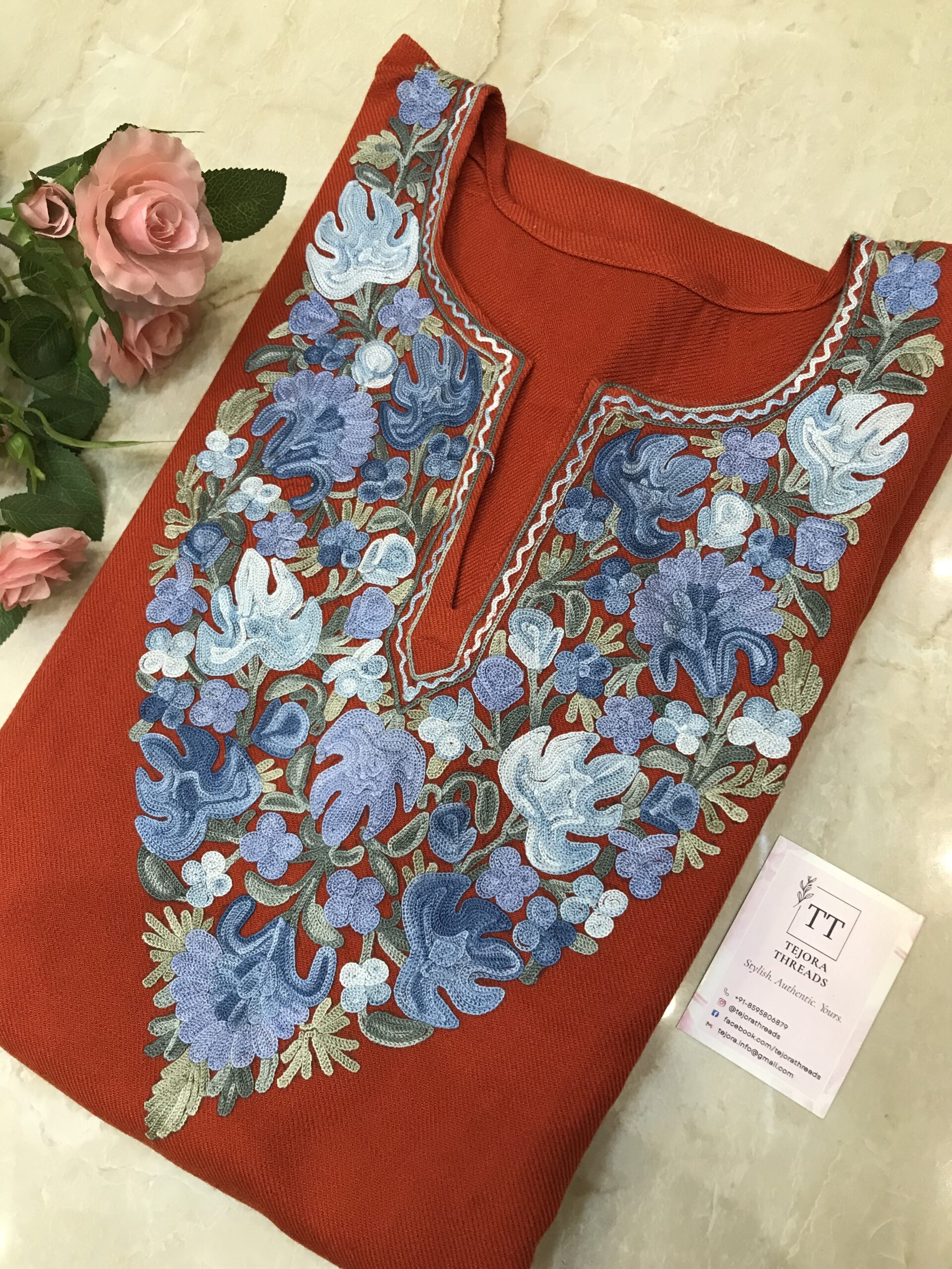 Step into timeless Kashmiri elegance with Tejora Thread’s New Winter Collection. This premium woolen Phiran features a classic notch neck design and is adorned with exquisite Kashmiri Aari embroidery in vibrant floral motifs. The embroidery extends gracefully to the sleeves, adding to its artisanal charm. With a versatile 40-inch length, this Phiran offers both comfort and sophistication – perfect for festive gatherings, cozy evenings, or everyday winter wear. A masterpiece that beautifully blends heritage artistry with modern winter style.